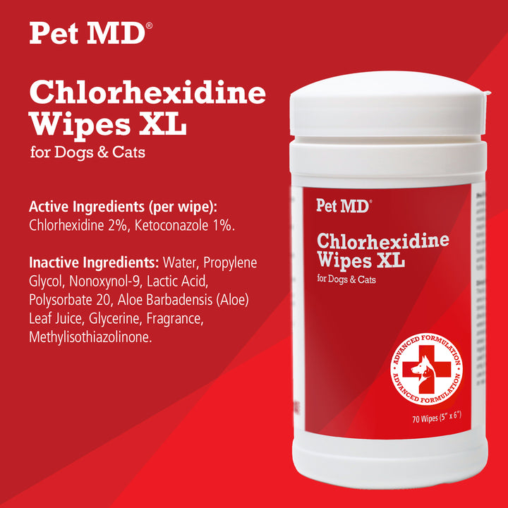 Pet MD Chlorhexidine Antiseptic XL Wipes are the easy and convenient at-home solution to your pet's skin conditions. The antiseptic and antifungal solution treats infections, acne, fungus, cuts and scrapes. EXTRA-LARGE...