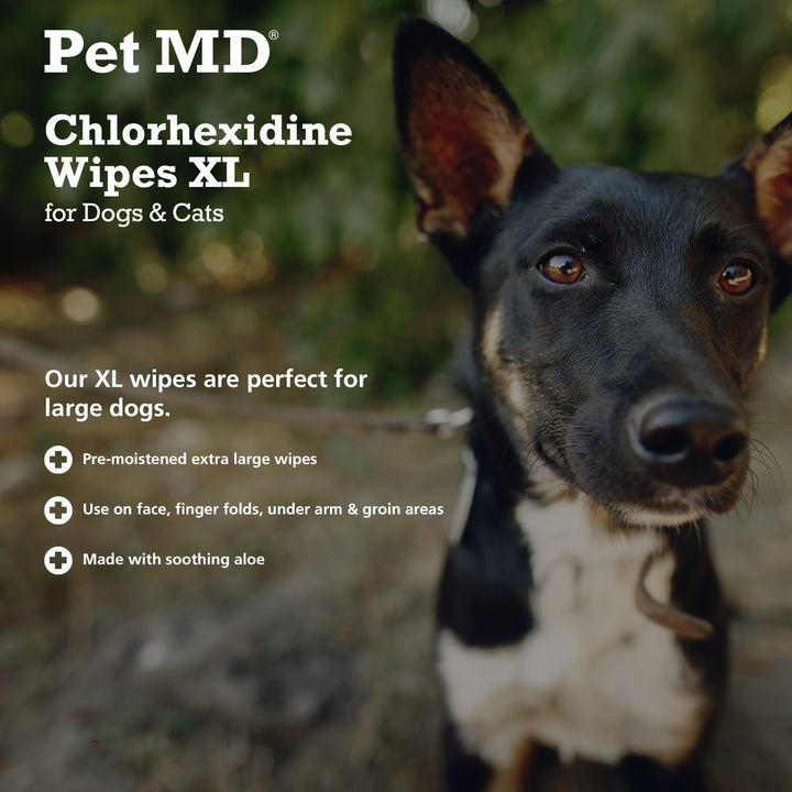 Pet MD Chlorhexidine Antiseptic XL Wipes are the easy and convenient at-home solution to your pet's skin conditions. The antiseptic and antifungal solution treats infections, acne, fungus, cuts and scrapes.