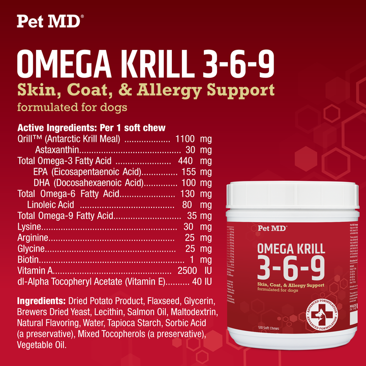 Omega Krill 3-6-9 can help keep your dog’s skin and coat in tip-top condition with a tasty yet functional chew that dogs love. An omega 3-depleted diet can leave their skin dry, itchy, and inflamed, with coats looking lackluster and brittle. Our carefully selected ingredients may help defend your dog against environmental allergens and can support healthy skin moisture.