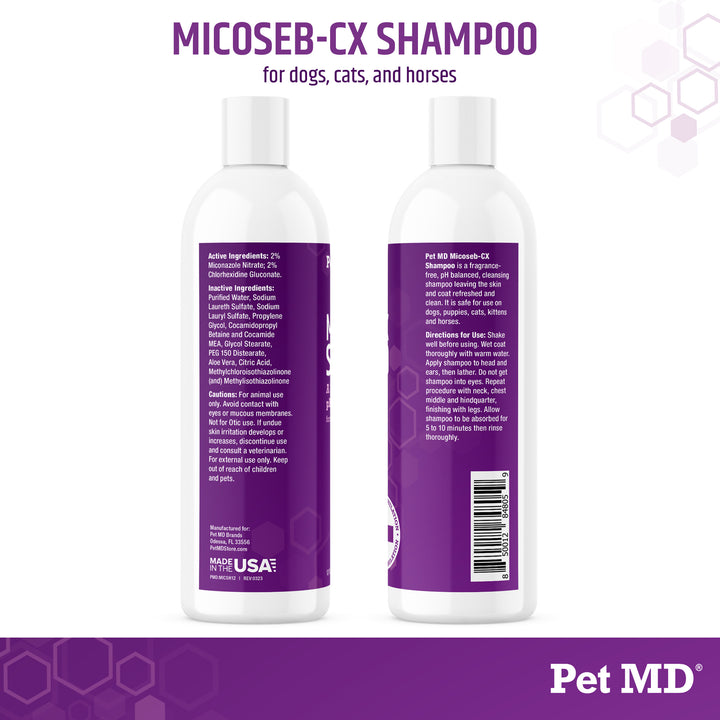 Pet MD Micoseb-CX Shampoo is a broad spectrum antibacterial and antifungal medicated cleansing shampoo with both Miconazole Nitrate and Chlorhexidine Gluconate. These highly effective ingredients help improve the condition of unhealthy skin or coat caused by fungi, yeast or bacteria. Micoseb-CX Shampoo washes away microorganisms that can cause itching and dry, patchy skin leaving a coat that is refreshed and clean. It is safe for use on dogs, puppies, cats, kittens, and horses.
